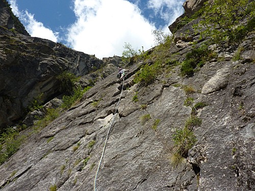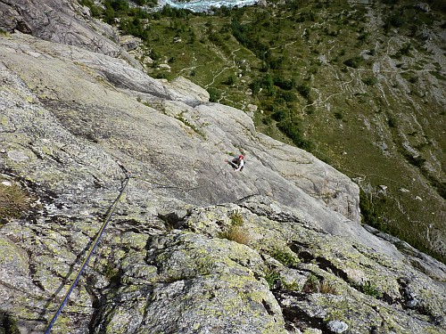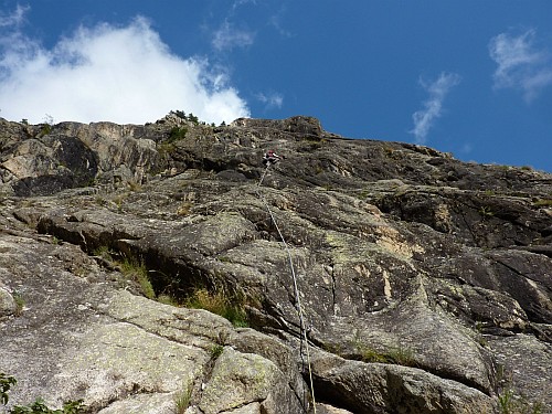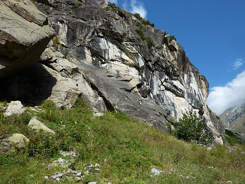 Úplně vlevo je stěna ohraničená roklí. Cesta, kterou jsme vybrali, vede hned vpravo od této rokle a v horní části se stáčí doprava nad pás převisů. Název je A tire d´Aires froides. Obtížnost 5c, osm délek. Odchod z kempu jsme nijak neuspěchali. V pohodě nasnídat, trochu se srovnat ještě po včerejším příjezdu a odcházíme. Ale ouha. Říčka, která ráno vypadala docela snadno překročitelná, je teď kolem desáté rozvodněná. Sluníčko ohřívá nahoře ledovec a voda z něj nám naplnila koryto a ztěžuje přechod. Až dolu k mostu se nám nechce, tak sundat boty a přebrodit. Brr !!! Studené. Za řekou přes loučku a ke stěně. Nástup chvíli hledáme. Úpatí stěny a její první metry jsou vlhké a zarostlé. Na první pohled nic krásného.