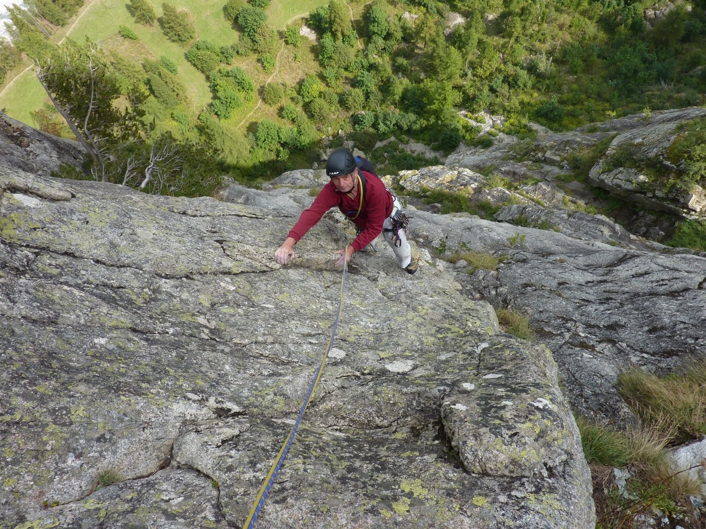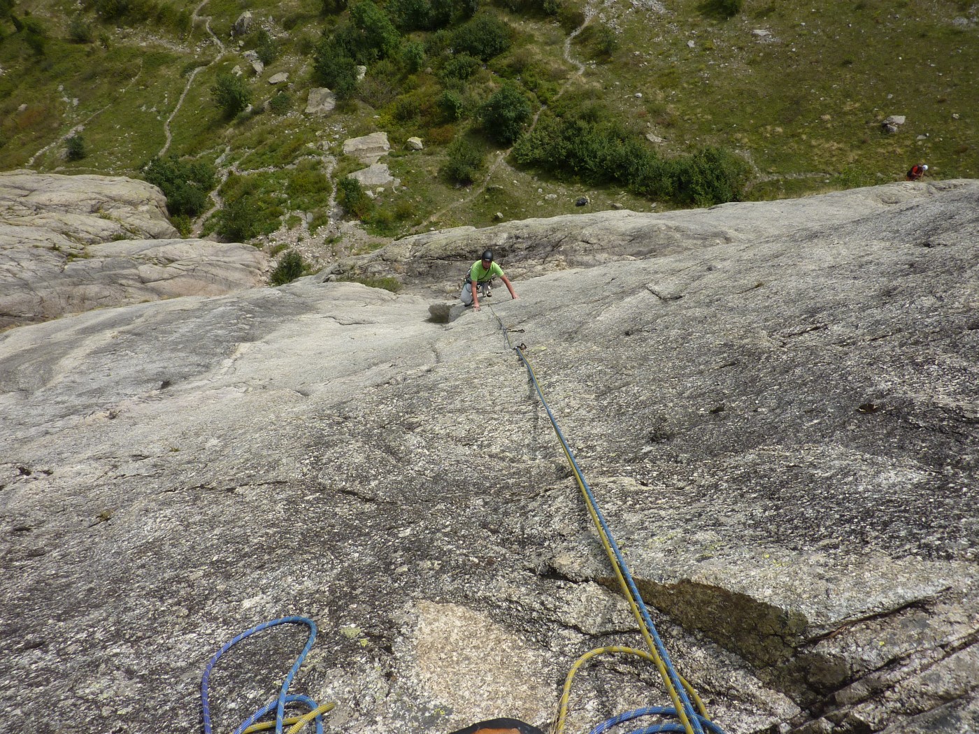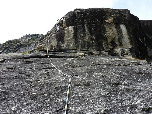 Chvíli se dohadujeme, kdo začne. Sváťa i já se cpeme dopředu a hlídáme si délky na prvním. Ani jednomu se nechce přijít o lezení s lanem odspoda. Takže se poctivě střídáme. Nakonec nastupuje Sváťa. Chvíli hudruje. Mokrá skála, tráva a tak. Za chvilku se ale jeho hlášky změní. Pěkný a dobrý jsou nejčastější slova, která slyším. Lezu a musím mu dát za pravdu. Po prvních nepříjemných metrech je skála najednou čistá, pevná a dobře členěná. Obtížnost se ustálí na 5c a taková zůstane v podstatě až do konce. Lezení je kupodivu více stěnové než rajbasové. Plotny, po kterých vede výstup, jsou většinou dost příznivě vrstvené, i když místy jsou úseky, kdy je nutné lézt na tření. Žula je taková přátelská. Ne jako třeba na Handegu – trhliny a rajbasy a většinou ostré hrany. Tady jsou sice i rajbasy, ale i v plotnách jsou chyty, stupy a především skála tolik nebolí. Navíc vše výborně odjištěno nýty.