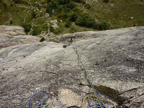 Ráno. Znovu jako první den jdeme na La Poire , ale tentokrát na Gauche . Levou část sektoru tvoří dvě nádherné plotny. Cesty přes tyto plotny sice pokračují nad nimi přes travnatý úsek dál do další, ale již ne tak pěkné stěny. Nás proto zajímá jen dolejší část. Úsek přes plotny má vždy cirka pět délek.