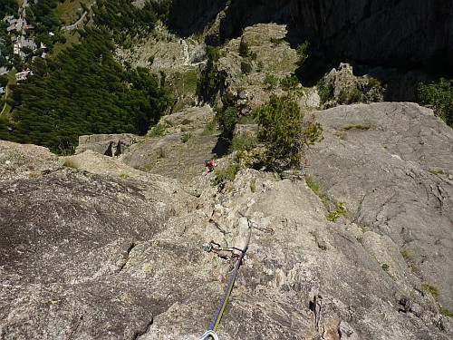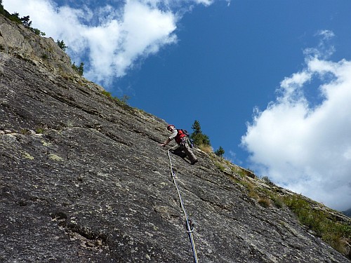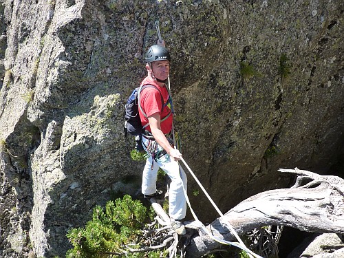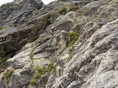 Horní část stěny je hladší. Stále je však lezení pěkné. Jen to slunce trochu moc praží. Jsme nahoře. Posezení s krásným výhledem do údolí a na okolní stěny a štíty. Chystáme se k sestupu. Z této stěny jako jedné z mála v této oblasti se dá podle průvodce lehce sestoupit. Pěšinka nás vede vlevo a je z počátku pohodlná, Pak však přijde mokrý a nepříjemný sestup do rokle a pomocí fixních lan v docela slušné expozici traverz na druhou stranu. V jednom místě vytržené nýty houpající se na ocelovém laně. Okolo rozlámaná skála, ze které vytéká voda. Konečně jsme v lese na pěšině. Nebylo to zas tak zlé. Sestup už dál vede prudkou strání mezi stromy a za chvíli jsme dole u říčky. Přímo před námi je most. To je dobře, protože říčka už je značně široká a voda v ní docela burácí. Brodit bychom už ji nechtěli. Za pár minut jsme u stanu.