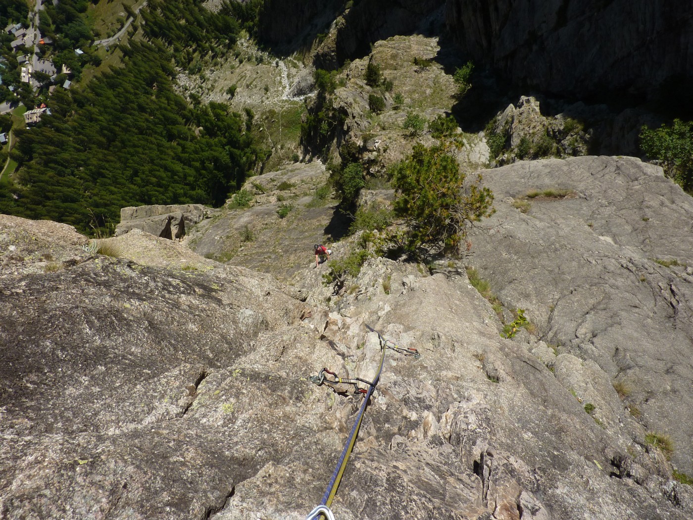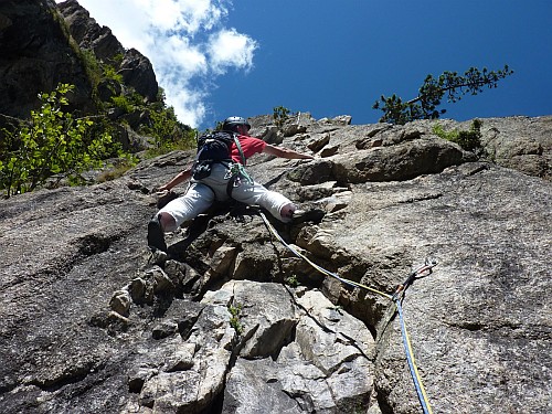 První cesta La Cocarde v sektoru La Poire . Obtížnost 5c, šest délek. Před námi nastupuje smíšená dvojka. Jsou trochu pomalejší, ale není to nejhorší. Po chvíli čekání nastupuji krátkou kolmou stěnkou do položené hladké plotny. Plotna je skutečně hladká a ne až tak moc položená, jak se ze země zdálo. Po chvíli rozkoukávání a seznamování se s místní skálou to nakonec docela dobře jde. Sváťa má druhou délku, zajímavý travers doprava nad převisem po skalní žíle, která je zvláštně členěná. Jako by někdo do roztavené skály vtiskl hranaté kameny, a to celé nechal ztuhnout. Vše je dokonale pevné. Třetí délka vede plytkým vhloubením a plochou stěnou technickým lezením. Ze štandu to sice nebylo vidět, ale je tu sem tam chyt i stup. Stále pěkné lezení, a tak to zůstane až nahoru. Slanění a zpět na kemp.