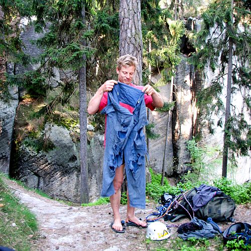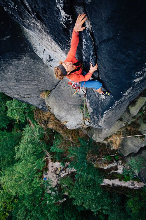 Mezi lidma co potkáš ve skalách vyniká helmou, prsákem, striktní etikou a lezeckým vkusem. Přitahují ho cesty, kterým se normální smrtelník spíš vyhýbá, takový ty co mají místo kruhů vykřičníky.. Natáčeli jsme v Sasku, kam se btw Alešák přestěhoval, přelez jedné z nejkrásnějších hran - jo, je to ta ze Sharp Endu: „Amící z toho udělali trochu drama.. Nejdřív to měl lízt Cedar Wright, to je ten s barevnýma ponožkama a strašně ošklivým psem, ale pod nástupem vyměknul, tak do toho poslali „okatýho“(Honolda), no a ten to vylezl. Cesta se dá místy dojistit smyčkama, je to ale trochu hledání a úplně tutový nejsou.. Je to skvost, umělecký dílo“. No a samozřejmě jsme se podívali i do Ádru, do Cikánovy vyhlášené spáry „Sen Čumilů“. Alešák vystudoval fyzioterapii a následně deset let pracoval jako letušák. Jednak se necítil na vstup do českého nemocničního prostředí, jednak potřeboval mít spoustu volna na lezení. Teď žije v Heidenau, pracuje jako trenér ve firmě nabízející systémy k jištění a zachraňování ve výškách a hloubkách, a když odbije půl čtvrtá, vyráží pravidelně lovit cesty s duší.