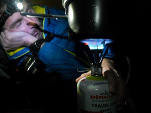 I přes Baníkov to šlo, docela jsem si to užíval. Nejtěžší místo jsme obešli letní cestou. Řetěz byl vidět. Silvestrovský večer jsme strávili ve stanu pod Hrubou kopou. Žádné šampaňské, jen trochu koňaku z plaskačky. Večer jsem se cestou na záchod málem zabil.