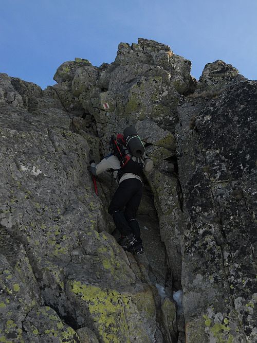 Za příznivých podmínek je hřeben Západních Tater klasifikovaný jako II UIAA. Pojmenování cesty nevím, myslím, že se cesta jmenuje Sklenička. Během období, co jsme se pohybovali na hřebenu, panovaly podmínky velmi nepříznivé. V předvánočním období přišlo sněžení s následným oteplením a v kombinaci s větrem bez sněžení extrémním ochlazením v období kolem Štědrého dne vytvořilo počasí takzvané skluzavky. Každý svah byl extrémně nebezpečný, na každém svahu hrozilo uklouznutí až do doliny. Snažil jsem se na to nemyslet. Sníh byl tvrdý jako led a připomínal žehlící prkno. Jeden krok měl cenu jednoho lidského života!