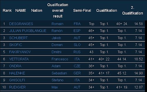 Rus Dmitrii Fakiryanov vydržel s bandaskami o něco déle a obsadil tak 3. místo a poprvé se octl na stupních vítězů,  Rakušan Jakob Schubert byl druhý, dolezl stejně jako a to vítěz Desgranges, který měl ale lepší umístění v semifinále. Slovinec Domen Škofič skončil 4., což mu ale stačí, aby se udržel na špičce rankingu v obtížnosti.