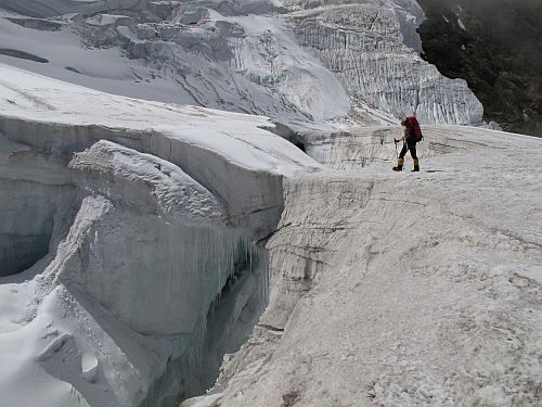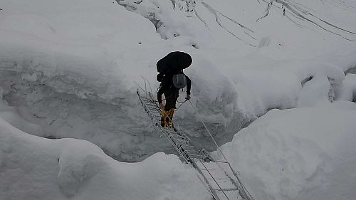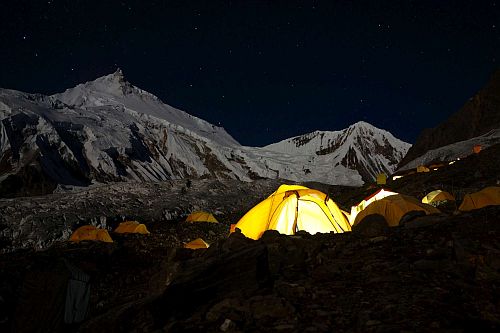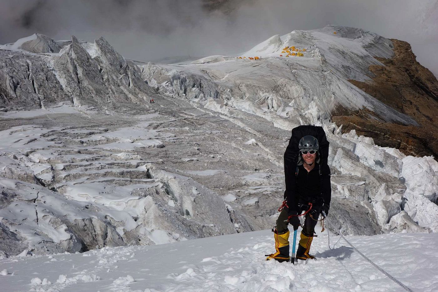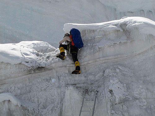 Sestup byl rychlý, v C4 sbalit stan a dolů, až do C2. Zde jsme celkem vyšťavení zase stan postavili a padli do něj s příjemným pocitem dobře vykonané práce. Ráno jsme se sbalili a museli po cestě ještě překonat již značně poničený žebřík přes trhlinu. V C1 jsme přibalili náš druhý stan a silně obtěžkáni jsme sestupovali do BC. Po náročném sestupu už začalo stávkovat i moje koleno, se kterým jsem byl pouhých 6 týdnů před expedicí na operaci menisku, ale zaplať pánbůh, vydrželo až doteď.