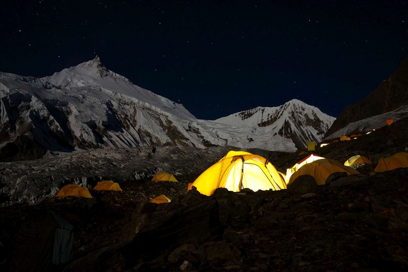 11. 9. jsme vyrazili na pětihodinový výšlap do BC. Základní tábor byl opravdu rozlehlý, nikdy jsme ještě tolik stanů pohromadě neviděli. Určitě jich bylo víc než 200. Když to srovnám s našimi dřívějšími expedicemi, kde jsme byli většinou skoro sami, tak si říkám, co tady proboha děláme? Ale osma je osma.