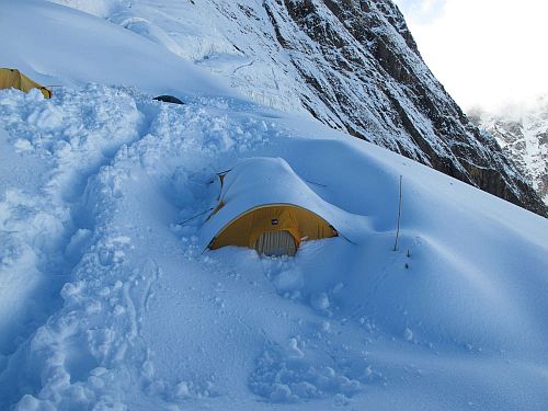 Po noci jsme pokračovali do C2, kde jsme měli postavený druhý stan. Taky byl slušně zapadaný, ale kvalitní značka a léty prověřená konstrukce stanu vše vydržela bez úhony. Někdy se holt vyplatí nést raději o kilo těžší stan, na který se pak člověk může kdykoli spolehnout.