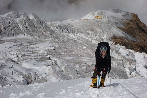 My další den stoupali nekonečným svahem a v horní části kličkováním mezi séraky do C4. V nejprudších pasážích před C4 jsme se míjeli s totálně vyčerpanými klienty, které šerpové opatrně sváděli dolů. Bylo to poměrně vyčerpávající čekat s těžkými batohy, až přejde skupinka dolů, a když se člověk rozpohyboval, tak se vzápětí objevili další. Nakonec jsme se však do C4 vyškrábali, srovnali plošinu na stan, postavili ho, zalezli do něj a vařili a rozpouštěli sníh snad 3 hodiny, abychom se pořádně zavodnili a snížili riziko omrzlin.