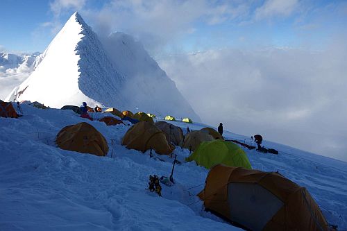 27. 9. se konečně vydáváme k pokusu o vrchol. Nebyl jsem si jistý kvalitou mé aklimatizace, ale jak se později ukázalo, 16 dní okolo 5000 m a výš, bohatě stačilo a bolest hlavy se už neukázala. Po příchodu do C1 jsme vyhrabali náš zapadaný stan, který to přečkal bez jakýchkoli poškození, což se nedalo říci o některých okolních stanech. Našemu kamarádovi Vasilovi z Rumunska kompletně stan lehnul k zemi, polámaly se některé tyčky, takže měl trochu problém, kde spát, ale nakonec se našlo místo ve stanu našich kamarádů z BC, co měli zaplacený servis a šerpu až na vrchol.