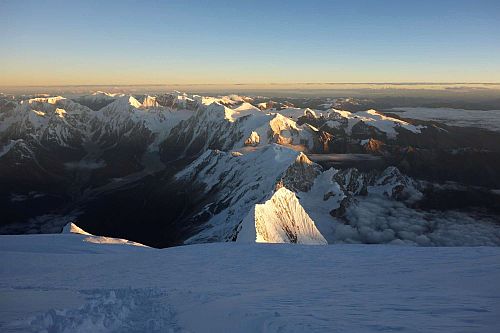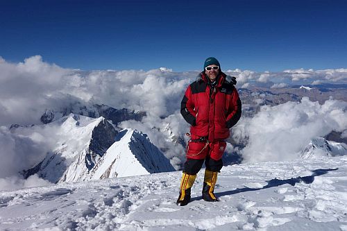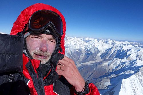 Z předpovědi počasí jsme si pamatovali, že by se mělo další den večer zkazit počasí, tak jsme k vrcholu vyráželi jako většina už kolem jedné hodiny v noci. Foukal celkem čerstvý vítr a teploměr ukazoval -27°C. Nohy byly ještě rozehřáté ze spacáku a vnitřní botičky taky, tak se šlo celkem dobře. Horší to bylo až těsně před svítáním, ale neustálý pohyb prstů v botách zajistil, že nohy vydržely být citlivé až na vrchol. Pod vrcholem jsme došli našeho přítele Vasila, a nahoru (cca v 7:30-45) jsme došli zároveň i s ním. Pár nezbytných vrcholových fotografií, hlavně aby v tom větru neomrzly ruce, rychle se pokochat úžasnými výhledy, podat si ruce a honem dolů za teplem.