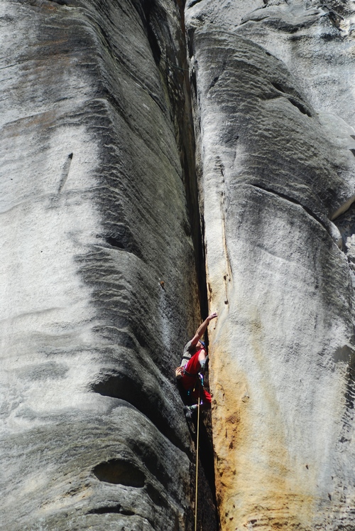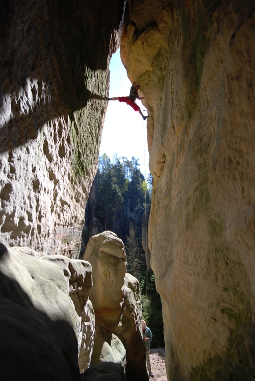 Cesta je přímá, má 10kruhů a dva slaňáky s klasickým adršpašským lezením - spáry, komíny, stěnové lezení a rajbasy. I když to není vyloženě těžké extrémní lezení, moc si té cesty cením, je to srdcovka."