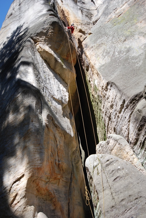 Následně  v dalších dnech jsme dolezli komínem, spárou a stěnou, po osazení 4 kruhů a slaňáku, na plató. Z plata se leze rajbasem přímo přes 4 kruhy na vrchol.