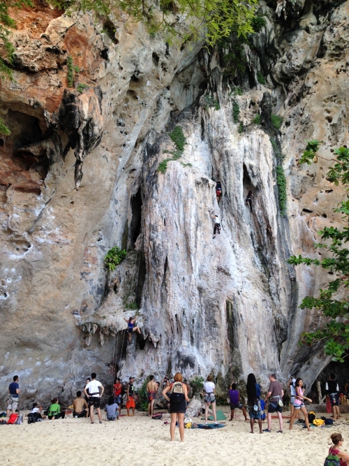 Jak je vidět na obrázku z Phra'Nang,  sektory s lehkými cestami jsou obsypány frekventanty, kteří lezou většinou na top rope.