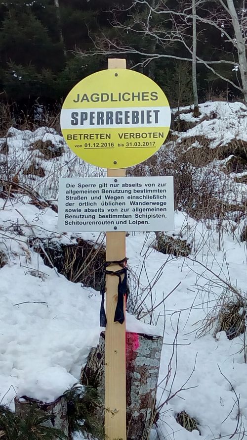 Po telefonických rozhovorech s místními obyvateli jsme se rozhodli vyrazit co nejdřív na každoroční úžasnou zábavu a zákazy prověřit. Bohužel došlo k tomu nejhoršímu. Nad silnicí na levé straně u ledopádu Columbus, u nástupu na Strannerbach a u společného nástupu ke Kathedrale, Gamseku, Wintasunu a Superfeuchtu jsou umístěny cedule s následujícím textem: Myslivecká uzávěra - uzavřený prostor - vstup zakázán. Od 1.12. 2016 do 31.3. 2017. Pod touto kulatou cedulí je další tabulka, kde je následující informace: Zákaz platí mimo silnice a cesty včetně obvyklých turistických chodníků, sjezdovek, skialpinistických a běžeckých tras.