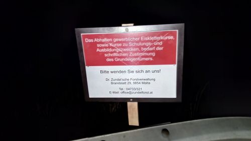 V esovité zatáčce, odkud je např. přístup k ledopádu Aluhol, je umístěna další cedulka s následujícím textem: Kdo chce provozovat kurzy ledového lezení ( dalo by se říci komerční výuku), ať zavolá na firmu Dr. Zundel'sche. Dodržování těchto účelových zákazů denně kontroluje policie z Malty a navíc do údolí ještě zajíždí zaměstnanec firmy Dr. Zundel'sche Forstverwaltung, která je majitelem pozemků. To jsou oficiální informace a každý si je může ověřit. Neoficiální informace od místních obyvatel jsou ale trochu jiné. Stávající majitel pozemků se nedohodl se starostou obce Malta o výši přidělených finančních příspěvků za pohyb návštěvníků na svých pozemcích a vymyslel si historku o "myslivecké uzávěře".