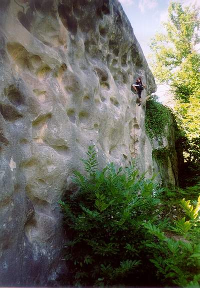 Druhý den jsme šli lízt. Janě se podařilo přelézt Rapper 5c+ a Over Booking 6a OS. Lezla i Maruška a šlo jí to také dobře. Pro Martina jsme bohužel neměli sedák a tak byl o nevšední zážitek ochuzen. Pak jsme se šli podívat do jeskyně a vymýšleli jsme jak asi vznikla. Celkem jsme zastávali tři hypotézy. Martin tvrdil, že vznikla přírodně, já že ji udělali ufóni a holky zastávali teorii, že ji udělali lidi nějakýma strojema (taková blbost může napadnout jen ženský). Kdo byl v Massone, tak však ví, že jeskyni si udělali lezci, aby mohli jejím stropem lézt těžké cesty.