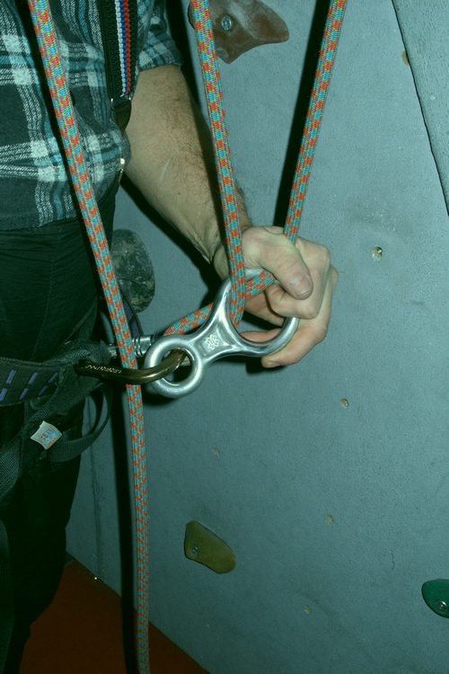 Stejně tak je tomu i u případného jištění a to především u oněch „skalních jističů“ s osmou „narychlo“. Tu je ovšem třeba poznamenat, že vždy platí něco za něco. Je tu poněkud horší komfort dobírání lana. Ovšem i tomu se lze naučit viz další obr. Jen je třeba zajistit kolmou polohu karabiny pro propadnutí lana. Je tu ovšem další ohyb lana zvyšující brzdný účinek.