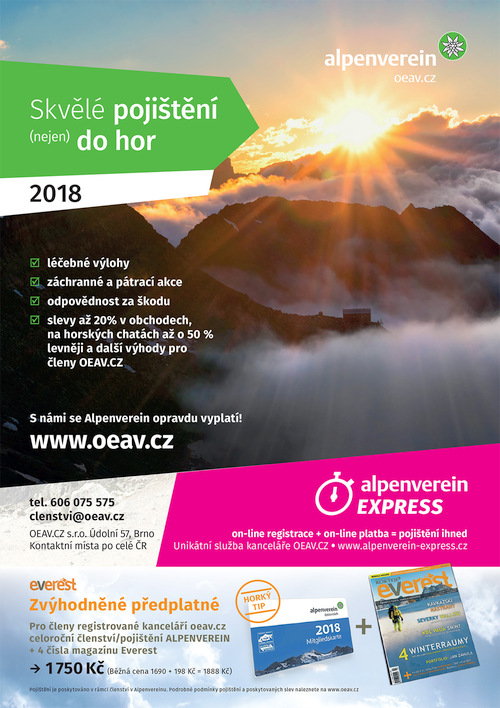 Staňte se členy rakouského Alpenvereinu, připlaťte si pouhých 60,- Kč a máte čtení na celý rok. Alpenverein jistě netřeba představovat, nicméně veškeré podrobnosti, podmínky a online objednací formulář naleznete na http://oeav.cz. Využijte až 20% slevy v outdoorových obchodech a další řadu benefitů. Novinka: Vyřiďte vše online a buďte pojištěni ihned bez dalšího čekání! http://oeav.cz/express
