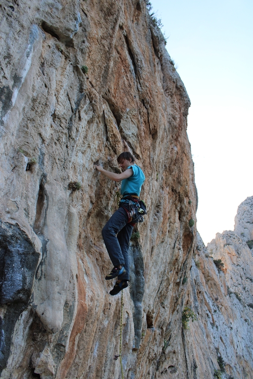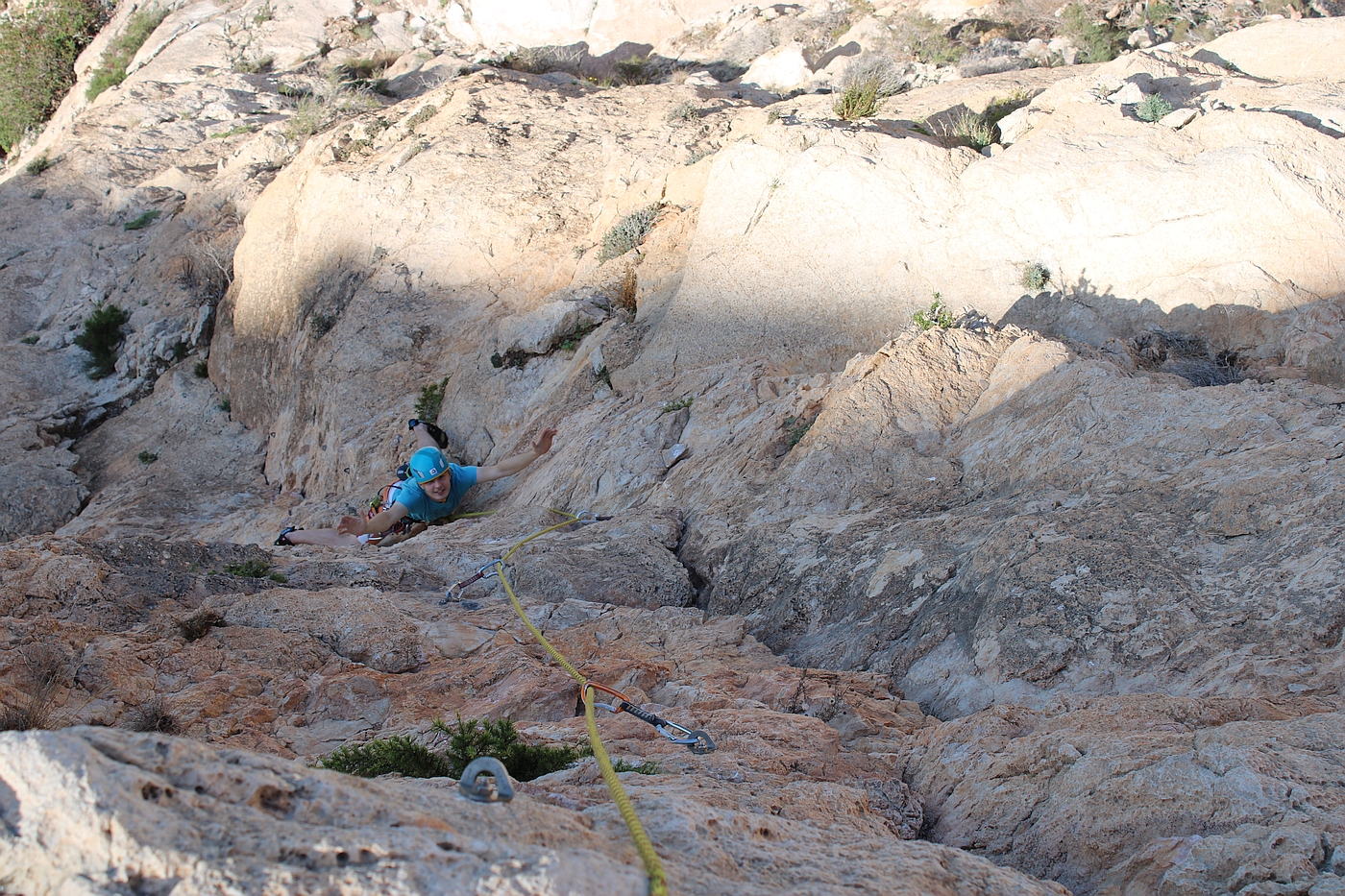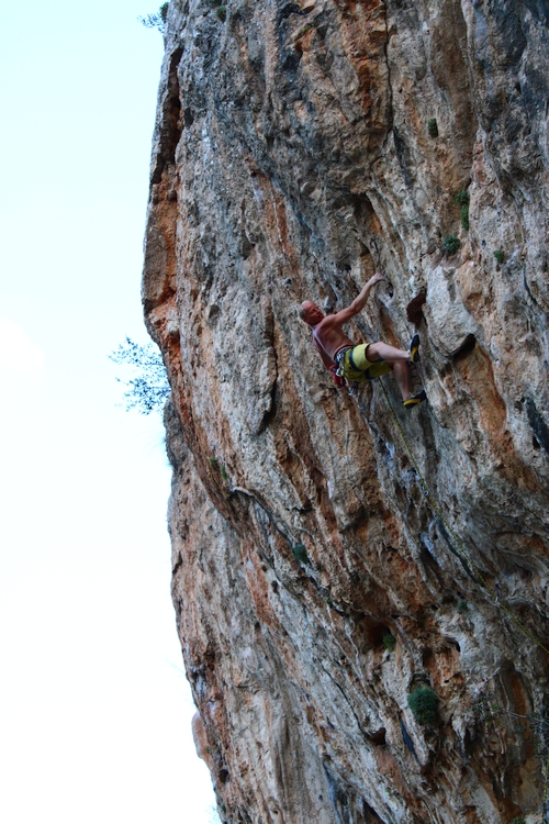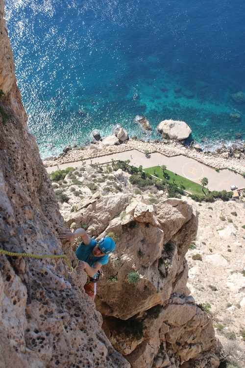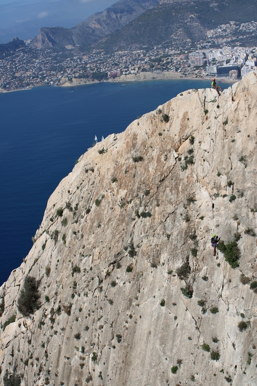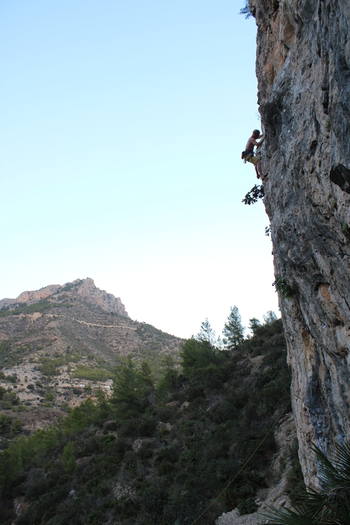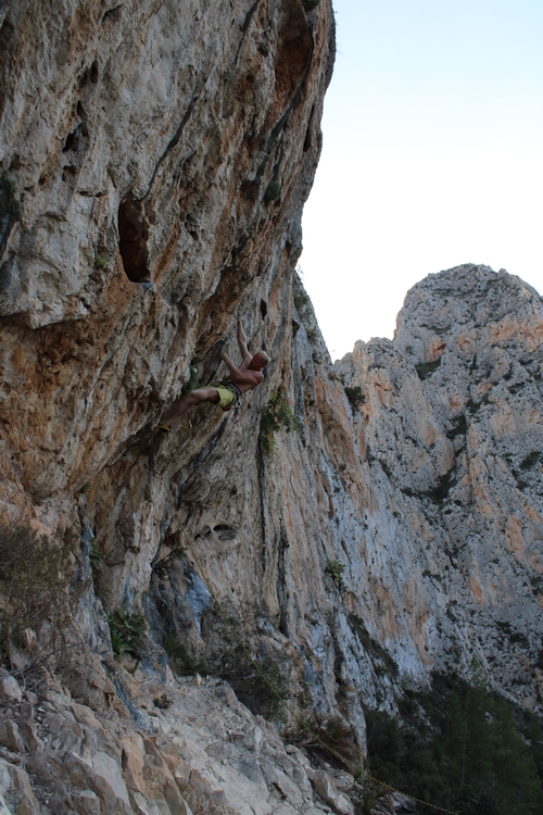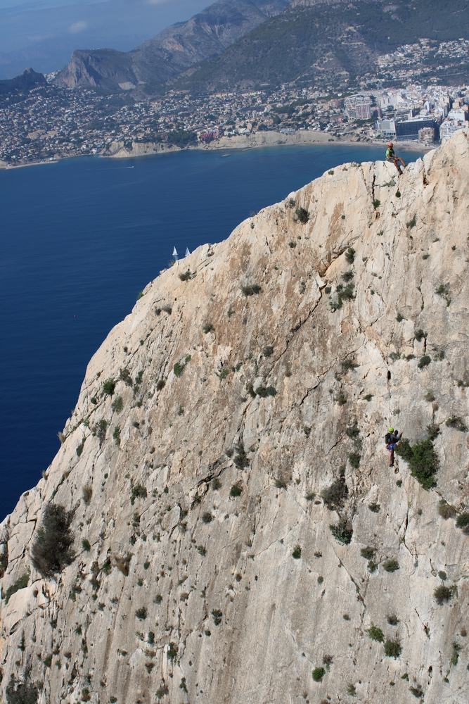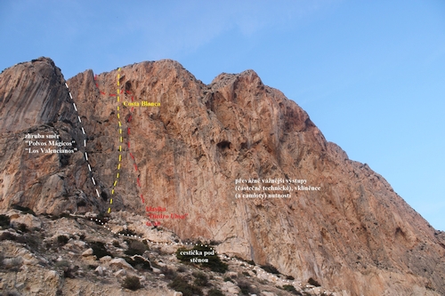 My jsme lezli sportovně odjištěnou klasiku Costa Blanca za 6c+. 250 nádherných lezeckých metrů, v dolní části převážně plotnami, nahoře čekají převisy. Na jištění stačí 15 expresek. Průvodce uvádí 5 hodin lezení, my jsme sedm délek zvládli vlažným tempem za tři hoďky. Nastoupit je určitě dobré hned po ránu, neboť do dvanácti hodin (některé části až do jedné odpoledne) je stěna v říjnu ve stínu. Máte-li rádi slunce, určitě s sebou hodně vody.