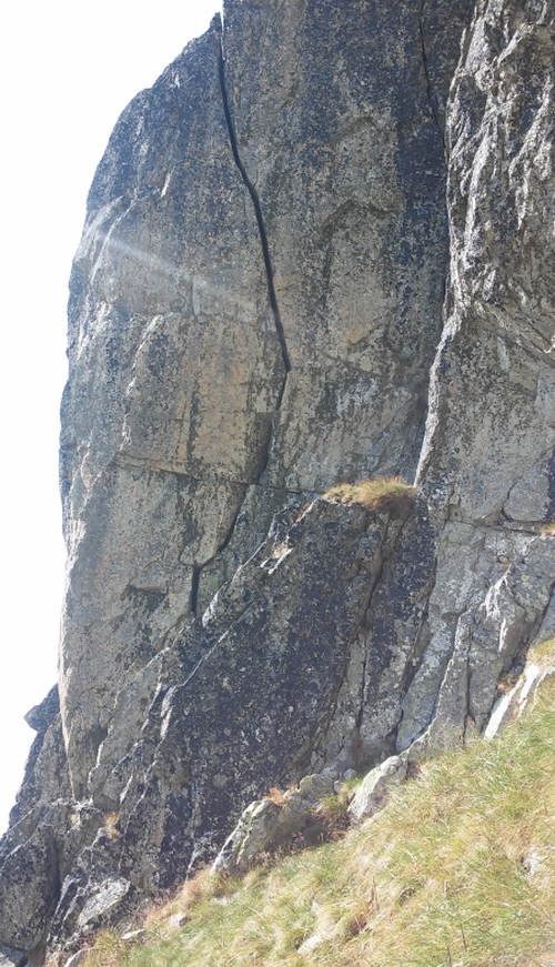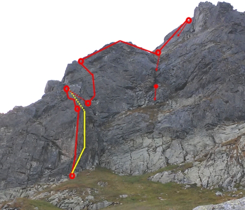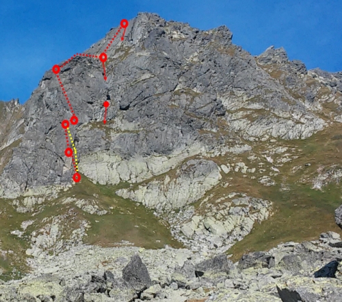 • 3. Stěnou mírně doprava za velký blok (2x nýt) a dáte přímo chytovatou stěnou (skoba, nýt) a pak míně doleva na hřeben. 50m, 5+.