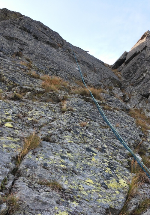 Prvotní zklamání ze široké spáry, která nás nepustila, během lezení trochu vyprchalo a jeho zbytky se definitivně rozpustily během večerního hodnocení výstupu. A tak jsme druhý den stáli opět pod spárou se sebevědomím vyztuženým večerní přípravou. Strategie byla jasná: strkat jediný kamelot spárou před sebou dokud to půjde a až to dál nepůjde, tak už to bude blízko a nějak se to doleze.