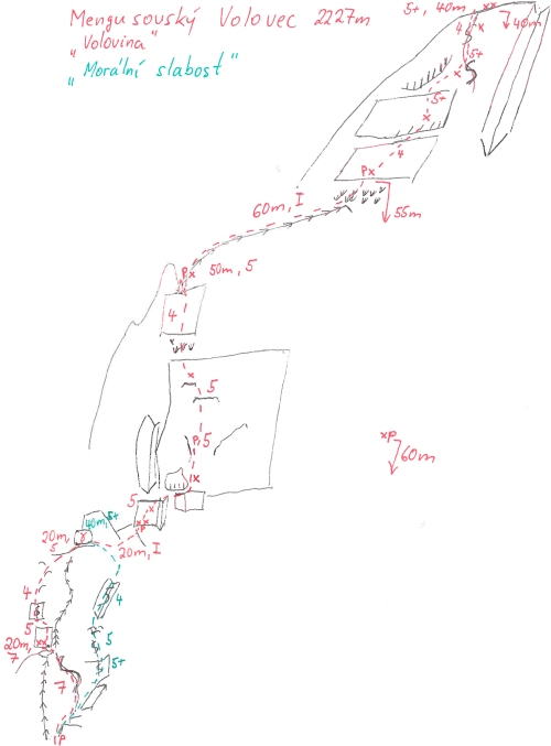Výsledkem našeho snažení je cesta Volovina s obtížností 7 a případnou lehčí variantou Morální slabost za 6–. Cesta vede severovýchodním pilířem Mengusovského Volovce asi 1h 30 min od Popradského plesa. Cestou na Volovku po 1h odbočíte přímo k pilíři. Krom první délky stačí běžné vybavení, štandy jsou osazeny a v cestě zůstalo 6 nýtů a dvě nebo tři skoby. Pro první délku je potřeba kamelot č.4 nejlépe vícekrát, nebo jít lehčí variantou.