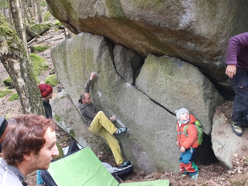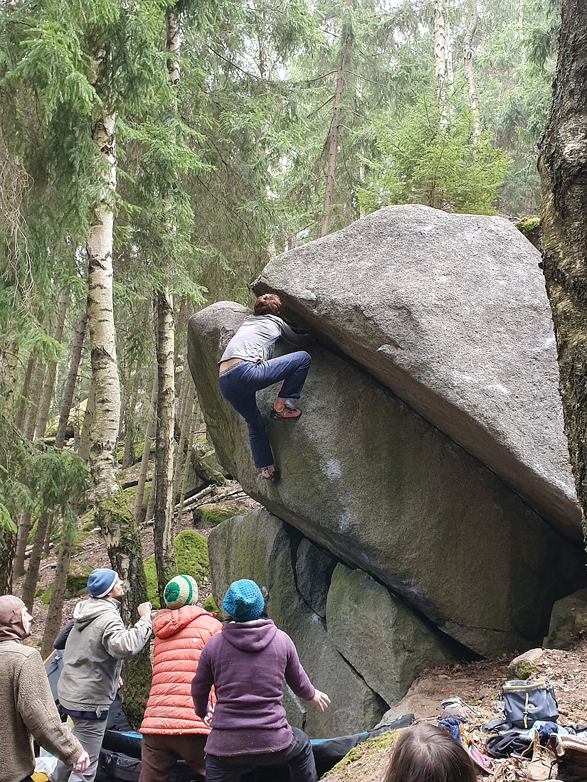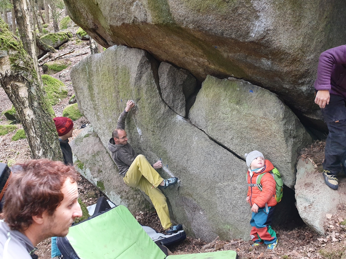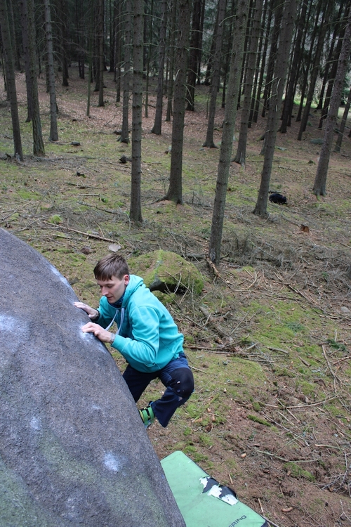 Kvůli Velikonocům a nadcházejícím květnovým svátkům jsem zvolil poměrně brzký termín a výsledek se dostavil – poprvé za ty roky během akce sněžilo a mrzlo. Tedy ideální boulderová podmínka!