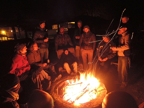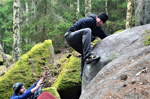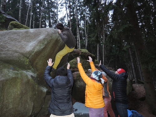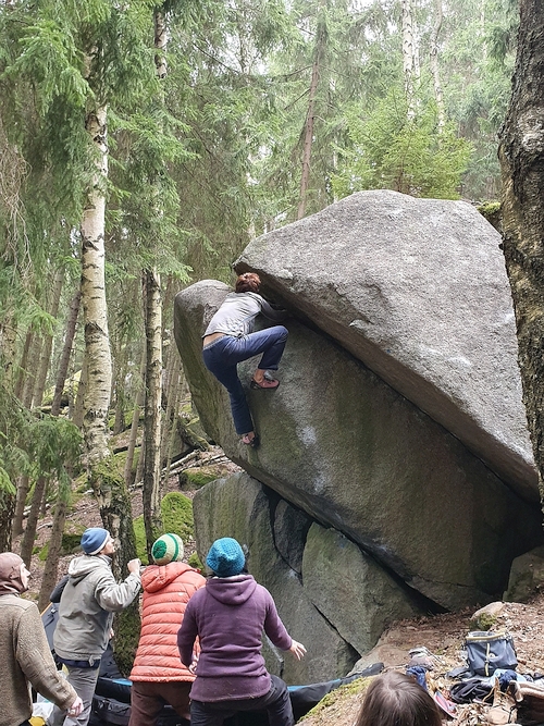 Průběh vezmeme ve zkratce. Ve čtvrtek večer jsem dorazil do chatičky (ve čtvrtek ráno tu bylo -6°C). V pátek ráno už jen jeden pod nulou. Trocha dopoledního dočištění, označení a v půl dvanácté jsou tu už první netrpělivci mířící do lesa za bouldery. Lidé se trousili, zalezlo se, posedělo u ohně, zapělo v teple společenské místnosti. V sobotu ráno za sněžení vyráží první nadšenci do skal už v půl deváté. Sníh proletuje asi do jedenácti, není ho moc a stromy jej zachytí, takže bouldery zůstávají suché. Odpoledne se teplota vyšplhá na nějaké plus 3-4°C. I přes skvělou účast a podmínku nejtěžší věci obstojí. Padly dvě 8A, tedy kromě toho ulítlého 8A+. Mimo soutěž ještě stihl Vasil přelézt starší kousek za 8A+. Nepadl překrásný skok, start + 2,50; cíl + 4,50. Magnus už držel horní hranu, ale neudržel. Nádherná linka čekající stále na přelez. Moc mě mrzí naražený kotník jedné z účastnic, doufám, že se vše hojí. Večer po vyhlášení stihla ona hrdinka ještě zahopsat na jedné noze do rytmu skvělé kapely La Fanka (ráno už neobula botu). Poseděli jsme dlouho, v 04:15 mrzlo a bylo jasno. V devět začal padat mokrý sníh, s lezením byl konec. „Alespoň už mě to neláká do skal“, řekl jeden z účastníků, a lidé se pomalu rozjeli do svých teplých domovů.