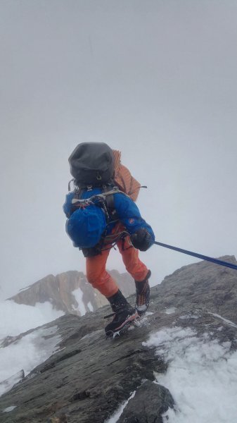 Mažeme proto spěšně dál, ale naše kroky začaly zpomalovat. Důvodem nebyla výška, ale terén. Žiletkový hřeben rozdělující kopec na dvě strany, byl jak Jekyll and Hyde. Dalo se tam nejlépe postupovat, nicméně severní srázy tvořil drobivý led a východní stranu našlehal vítr do sypké pěny. K tomu přibyly skalní prahy, vyžadující slanění. Celá ta linie bílého hada tvořící hřebínek, při pohledu ze shora vypadala, že visí jen ve vzduchu. Nekonečný kilometrový hřeben bez možnosti odjištění. S přibývajícím časem přišla od údolí neprůstupná mlha. V jednom místě jsem udělal chybu a dostal nás mimo směr. Jeden by řekl, že v takovém terénu to není možné. Ale je! Naštěstí zakufrování nebylo až tak dramatické. Nicméně stačilo jako připomenutí, že když není nic vidět skrze bílou tmu, nezbývá než čekat. Obzvláště ve chvílích, kdy pod nohama je díra do pekel a za každým špatným pohybem čeká více než tisícimetrový skok. Znamenalo to udělat další nechtěný pátý bivak, jenž ležel ještě stále hodně vysoko, víc než bychom si přáli. Všiml jsem si, že Hook se změnil. Po chvíli mi došlo, že jeho fous je celý bílý, připomínal dědu Mráze. Vítr přinesl z údolí nejen mlhu, ale i vlhkost s drobným sněžením. Malá police překrytá ledovým kšiltem byla v daný moment naše záchrana. V kvapu jsme doupravili místo a za několik málo minut už stál náš hotel Savoy. Došlo nám jídlo, jen dvě čokoládové tyčky pro dva hladové žaludky tvořily večerní menu. Vše jsme měli už mokré a zmrzlé. Přičemž fyzická únava se hlásila při každém pohybu i psychika se blížila ke svým limitům.