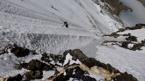 Nástup na ledovec pod stěnu začal 16.května. Máme s sebou bivakovací stan, jedno osmdesátimetrové lano průměru 7 milimetrů, šest šroubů do ledu, 5 skob, 5 friendů. Jídlo na pět dní a tři plynové bombičky. Nesmím ještě zapomenout na přibalené štěstí v batohu.