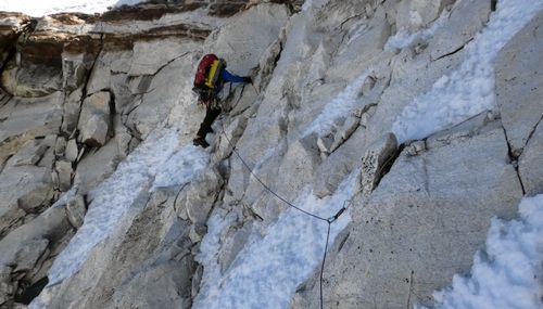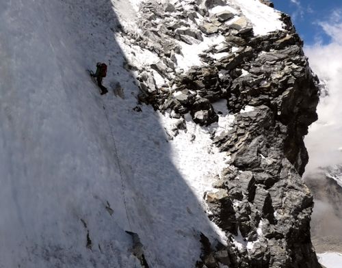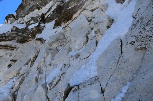 Následné brzké mrazivé ráno, bylo prosáklé napětím následujících dní. Hned od počátku nás první metry přivítaly nepříjemným mixovým lezením, které pokračovalo šikmo ubíhající rampou. Byla zde velice špatná skála s nedržícím sypkým sněhem připomínajícím cukr. Boj o každou píď. Pakliže budeme postupovat tímto tempem, tak na vršku jsme za měsíc, proběhlo mi hlavou. Nakonec metry se povedlo kousek po kousku ukrájet. Mačky skřípaly a cepíny odskakovaly, místo toho, aby dělaly s ledem pevné sevření. Po hodinách bitvy jsme dolezli na místo bivaku, schované pod skalním převisem, který skýtal naději, že padající kameny a sníh nás přeskočí. Hora nám v průběhu dne předvedla, že dokáže pustit pěknou lavinu ze svého držení. Okamžitě se srdce sevřelo v představě, že v daném místě bychom se právě nacházeli. Obzvláště, když přes ně stejně musíme dříve nebo později prolézt. Zatlačujeme oba dva děsivou představu někam hluboko do zapomnění.