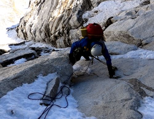 Třetí den byl klíčový, jelikož se jednalo o nejdelší lezecký úsek 700 metrů, s nutností dosáhnout až horní skalní bariéry. Neexistovala jiná varianta, pokud jsme chtěli mít šanci pokračovat dál. Riziko spočívalo v tom, že v momentě, kdy se vstoupí do této etapy, musí se pokračovat a není rozumné cesty zpět. Aby protivenství nebylo málo, tak v podstatě neexistovalo ideální počasí k průlezu. Jelikož sněžení i mírný vichr, může zapříčinit pády sněhových řek. Na to se dá vzít jed, že tohle nikdo ve strmé stěně neustojí. Naopak přílišné teplo uvolní kamení, které s vrčící zuřivostí rozdrtí vše, s čím se setká. Ráno padlo rozhodnutí jít dál a tak jsme se začali prosekávat sněhovými varhanami, které z dálky připomínají plisovanou suknici. Místy míjíme příjemný firn, ale také led tvrdý jak beton. Připomínalo to sisyfovskou práci, kde veškeré snažení se míjelo účinkem. Průlez nakonec nebyl ani tak technicky těžký, ale po sečtení desetitisíce pohybů, byl fyzicky velice vyčerpávající. Nehledě na to, že jištění v průběhu délek, nebo i při současném lezení nás obou, se dá diplomaticky označit za skromné. Den neměl konce a nebylo možné stále najít místo na třetí bivak. Drobné poletování sněhu nás ještě více popohánělo, abychom nějak uzavřeli neutěšený stav. Nakonec nezbylo, než se vtěsnat na maličkou sněhovou poličku sevřenou mezi skalním koutem. Hook se ujal vaření jako obvykle a rozpuštěný sníh smíchaný se šťávou rychle zavlažoval vyschlá hrdla a kroutící se vnitřnosti. Vůbec nevadila ta divná sněhová pachuť s křupavou příměsí žulových šupinek. Pak jsme si bez otálení začali hrát na teplo a spánek. Noc byla peklo. Nemohli jsme stále najít způsob, jak do prostoru na půl zadku dostat dva a ještě k tomu celá dvě těla. Nezbylo, než se položit na Hooka. Nezávislý pozorovatel by řekl něco v duchu, dvě do sebe zakouslé larvy. Však nevábné provedení, nakonec slavilo svůj úspěch. Každý z nás na chvilku ve spánku zadřel a mohl tak ušetřit trochu sil. Úmyslně neříkám zrelaxovat či nabrat energii, ale zbytečně se aspoň neztrácelo.