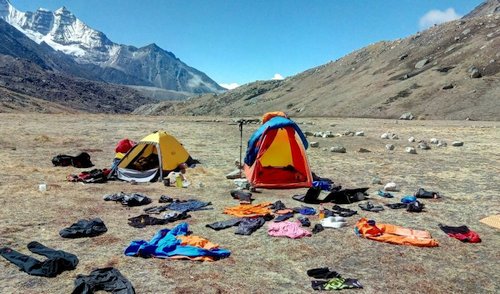 Čtrnáct dní před příchodem do Base Campu, jsme čas vyplnili běháním po údolích, úbočích a kopečkách. Zjitřené červené krvinky se začaly ve větším tvořit díky ubranému kyslíku a pozvolna vyplňovaly naše krevní řečiště. Naše aklimatizace plynula, bez velké bolesti občas podpořená voltáží San Miugelem pilsner. Takže až do momentu, kdy se vystavěly na zelené louce první dva bivakovací stany, kde byli dva kuchaři, dva nosiči, a dva účastníci, (myšleno já Maara a Hook), to šlo jako denní navlékání perlového náhrdelníku. Ve stejný moment přiběhla i jedna záda, která nás jako jediná nebolela. Byl to Antenzing Sherpa, který přinesl 20kilový batoh s lezeckým cajkem. Vzápětí po složení nákladu se otočil na patě, a zase zmizel, jak pára nad hrncem. A my zůstali uprostřed hor úplně sami. Krásné klidné místo bez lidí, obehnané bělostnými hřebeny divokých hor.