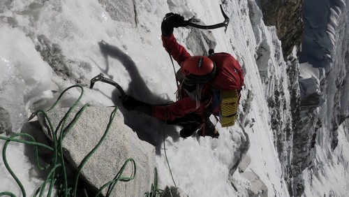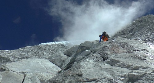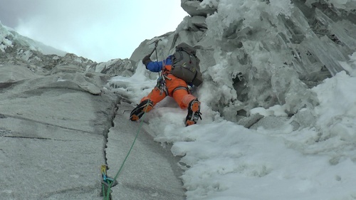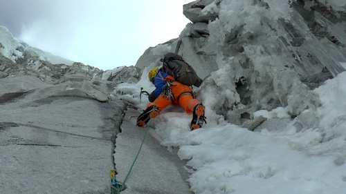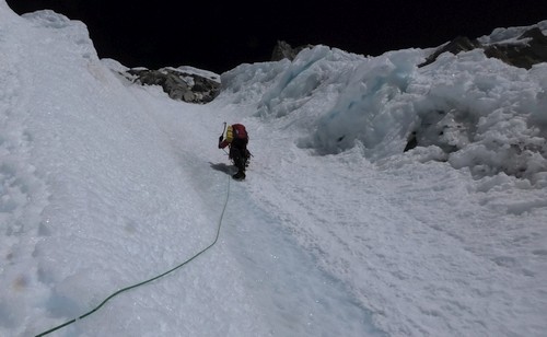 Následující ráno začínáme lézt hned s úsvitem. Jsem lehce zatuhlý z noci, ale za chvilku se již zahřívám. Stěna se začíná po chvilce narovnávat a sněhového pole přidává s nalezenými metry stupeň po stupnínku na své strmosti. Firn se pomalu mění na ledový podklad a skalní prahy. Po dvou hodinách souběžného lezení, dobírám Ráďu, kdy nad námi je souvislá 150metrová skalní bariéra. Tohle místo prolézt, je první klíč průstupu a zároveň vstupenkou, pro dalších tisíc metrů nad hlavou. Buď se zadaří a můžeme dál, nebo se sklopenýma ušima můžeme mazat dolů. Vše probíhá jak ve zpomalené grotesce. Snažím se lézt co nejrychleji, jelikož z vrchu padají šutry různých velikostí. Znamená to prolézt vždy až k místu, kde skála tvoří převis, pod který se dá jakžtakž schovat. Přesto jsem pomalý jak šnek a do toho funím díky výšce a hrůze, která mi ještě více mačká plíce. Skála je docela kompaktní a kvalitní. Však lezení vyžaduje nyní veškerou moji pozornost. Tudíž naprosto vytěsním z mysli padající „nazdárky“ a veškeré úsilí posílám jen na pohyb. Stejně vyhnout se něčemu, co vrčí a letí na vaši hlavu rychlostí víc než sto kilometrů v hodině, je téměř rovno nule. S velkým úsilím se sotva držím na skále, čili nezbývá prostor na rychlý únik a musím přijmout empirii osudu. Přemítám v hlavě, jakou že tu smlouvu mám uzavřenou s všemohoucím a zda hlavně je stále v platnosti. Tolik skutečnost. Průstup touto střelnicí, trval dlouhé vteřiny, následně nekonečné minuty, které přešly do útrpných hodin. Nakonec první problém jsme vyřešili a cesta dál se otevřela. Paradoxně cesta dolů byla uzavřená, pokud jsme nechtěli pokoušet opětovně štěstěnu, která nám přesmíru do této chvíle přála. Teď přišel na řadu dlouhý traverz druhého ledového pole, které v jejím levém horním rohu navazovalo na takové mixové esíčko. To začínalo výrazným skalním schodem, kudy bylo třeba šikovně proklouznout do pokračujícího sevřeného koutu. Ten na nás mával visícími ledovými smrkanci, připomínajícími píšťaly varhan. Bylo jasné, že další hádanka Huandoye stojí před námi. Téměř kolmá skála a na ní krusta ledu. Samo sebou touha byla, co nejvíce zaseknou cepín do masy ledu. Jenže ten tam nebyl a skála moc chytů také nenabídla. O jištění raději ani nemluvě. Občas se nějaké povedlo založit, ale spíše hrálo roli placeba, že nelezu čisté solo. Lano v té chvíli tvořilo pouze ozdobný doplněk, jak motýlek k fraku.