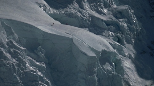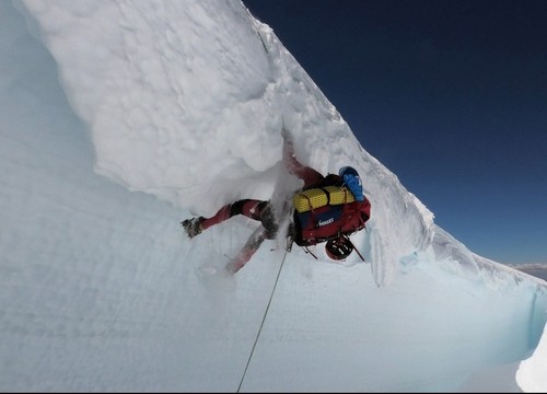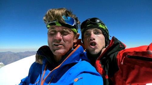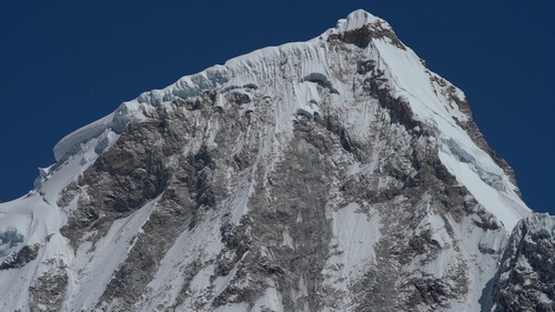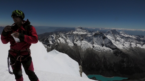 Konečně přichází úsvit. Koukám nad sebe, kde Ráďa začíná vařit vodu. Vzápětí se ozve řev, když půlku nádoby si nalije do zavěšené boty. Aby toho nebylo málo, nějaký škarohlíd pošle od vršku ledovou hroudu. Ta se na štěstí kousek před námi rozdělí na drobnější a jedna část mě zasáhne do zad. Vyrazí mi dech a připomene, že musíme dolézt na vršek co nejrychleji, než spadne něco většího a rozmázne nás v mastný flek. Teď nás dělí od vrcholového hřebene necelých tři sta výškových metrů, terénem, který není již technicky kdovíjak náročný. Jedno místečko s mixovým úsekem a pak v podstatě jen hodně strmý firn, střídající se s ledovými pasážemi. Nemělo by nás již nic zastavit, ale je jasné, že žádný fofr to nebude. Začínáme lézt a metry s podivem rychle odsýpají. O tři hodiny později, prolézáme poslední sněhový úsek, který při pohledu z údolí připomíná nařasenou sukni. Pod námi je celá expozice stěny a kolem vyrostlo celé kouzelné pohoří, na jejichž vršky neznámý cukrář posadil čepice z cukrové vaty. O dvacet minut později, něco málo před polednem, již stojíme s úsměvem od ucha k uchu na vršku Huandoye.