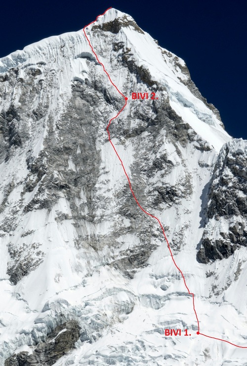 Naštěstí slunce zašlo za kopec a mráz začal zamykat do své náruče veškerý pohyb ve stěně.  Aspoň něco…, už nebudou létat šutry. Zároveň tím se naklonil čas i nám, kdy musíme začít přemýšlet a hledat místo pro další bivak. Jsem v horní třetině celého výstupu, která je nesmlouvavě strmá, ale dolézt na hřeben jednoduše nestíháme. Představa, že budeme stát na nějaké malé poličce celou noc, připomínající dvě ztuhlé trubky, nebyla kdovíjak lákavá. Tak zkouším popolézt o pár desítek metrů výš v naději, že se objeví nějaký zázrak v podobě dobré police. Však, opodál je stejné prd. Nedá se nic dělat, sděluji Ráďovi: „Musíme bivakovat zde.“ Oba máme úsměv po kyselém citrónu. To je vše, co můžeme dělat. Jsou tu dvě plošinky velikosti sedátka židle asi dva metry šikmo vzdálené od sebe. Privátní sedátko pro každého z nás s dírou pod nohama. Je potřeba trochu větší představivosti, aby v tom naše oči spatřily ložnice pro následující noc. Pravda, pořád lepší než drátem do oka.