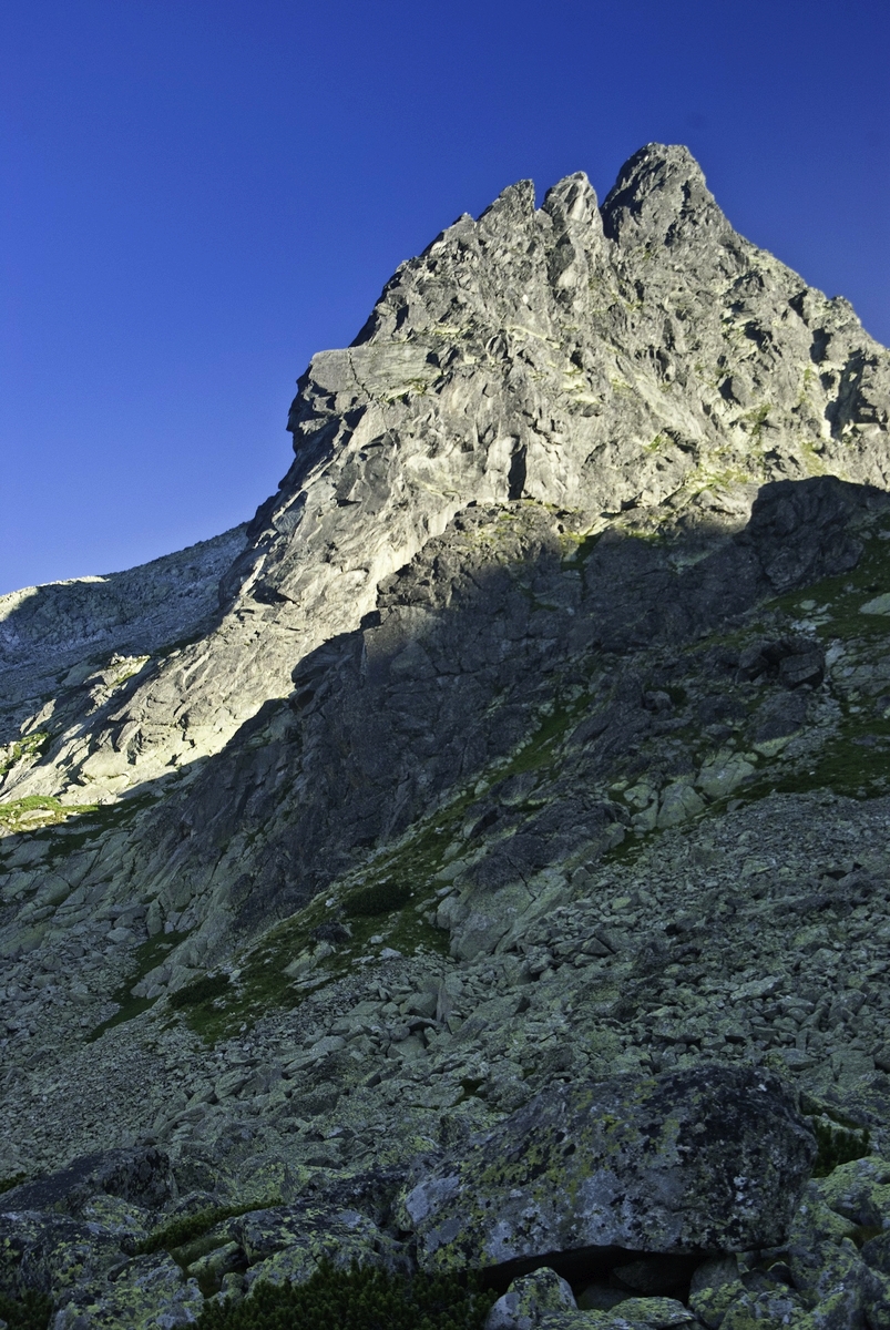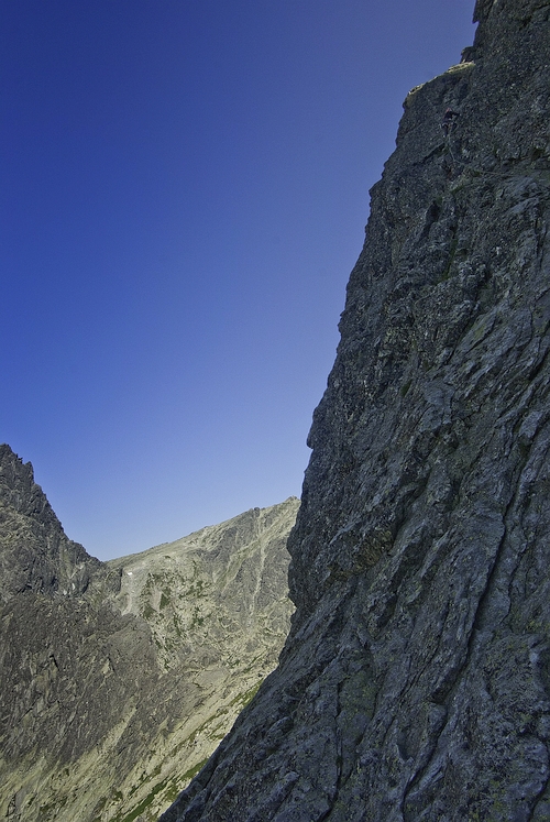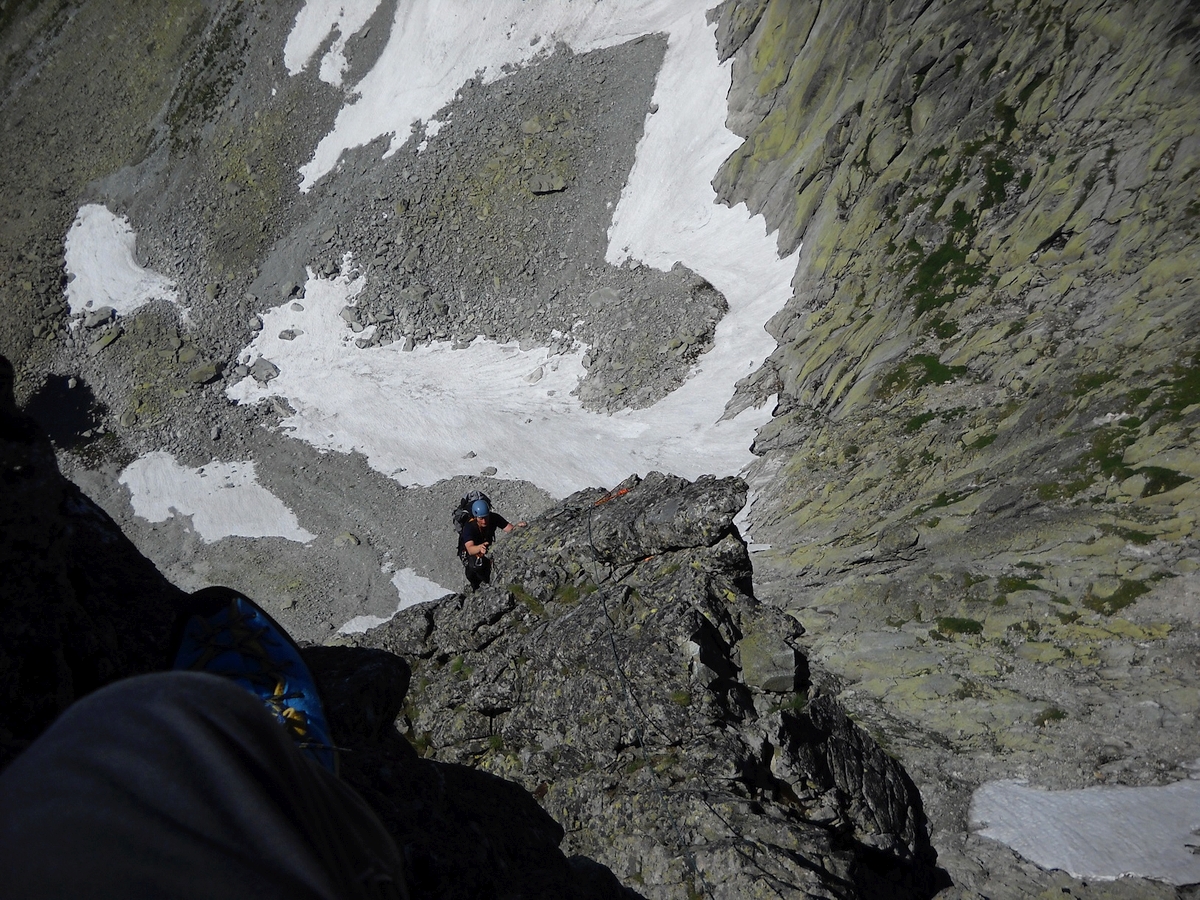 Cesta od Popradského a Zlomiskovou dolinu ubíhá dobře, po třech hodinách chůze jsme pod stěnou. Je zatím azuro, ale předpověď není dobrá, má přijít bouřka. Snídáme, oblékáme si sedáky a navazujeme se na lano. První délka je vcelku lehká, ale vede lámavým terénem plným volných kamenů. Josef leze první, potom já a poslední leze Jura.