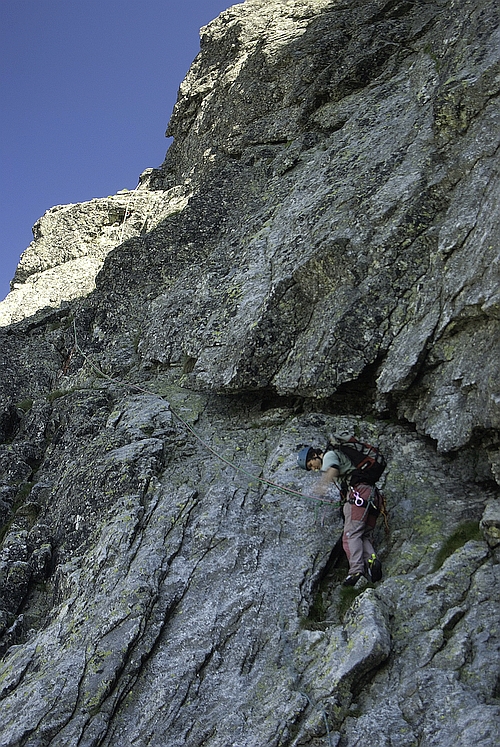 Druhá délka vede šikmo doleva na hranu pilíře a poté třetí délka přímo vzůru. Lezení ubíhá dobře kocháme se výhledy.