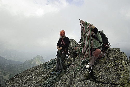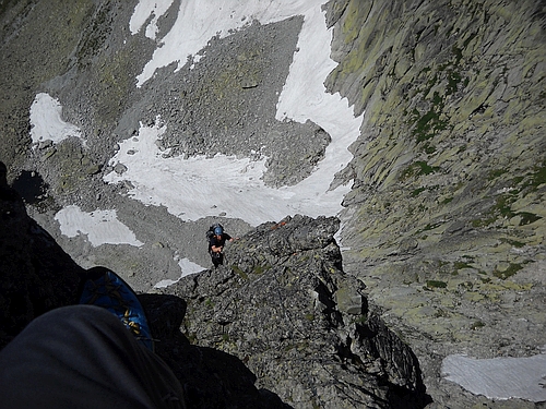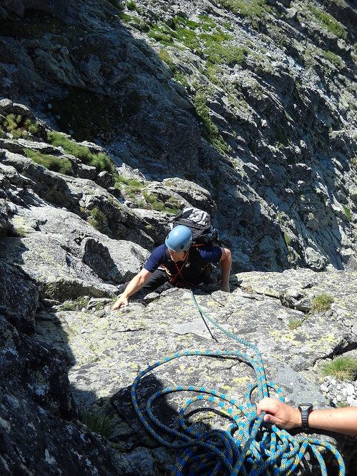 Pak cesta vede po rampě s následným nepříjemným traversem kde jsem měl trochu strach. Následuje chodecký terén a jsem na vrcholu. Motáme lana začíná nás honit bouřka.