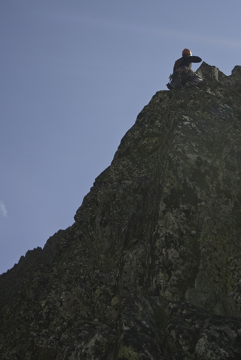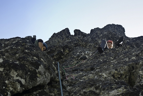 Na Ošarpancích jsem si lezení ve třech vyzkoušel jako druhý. Jistil jsem prvního a pak dobíral třetího. Lano furt v ruce. Celkem to byla fuška. Teď na Ganku jsem na to lépe připravený a nemám s tím žádné problémy.