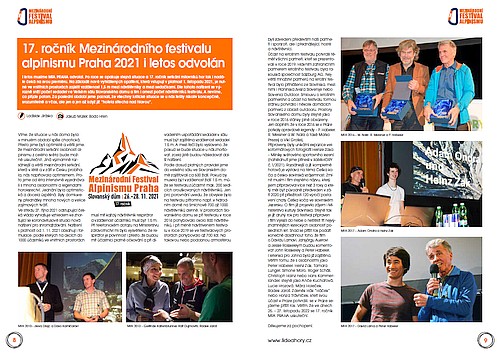 Po odvolání festivalu bylo proto představení programu a všech významných osobností alpinismu z celého světa, kteří účast v Praze na festivalu potvrdili, změněno a nahrazeno jinými tématy. Stěžejními tématy letošního předposledního čísla lidé&HORY jsou kromě posledního dílu povídání Radka Jaroše o jeho cestě za Korunou Himálaje především skialpové túry v údolí Ahrntal v Jižním Tyrolsku a rozsáhlé představení Slovinska jako alpské země vhodné pro turistiku, vysokohorskou turistiku a cykloturistiku. I bez zajímavostí o již téměř připraveném mezinárodním setkání osobností alpinismu najde každý milovník hor na 104 stranách mnoho zajímavého ze světa outdooru, horolezectví a volnočasových aktivit.