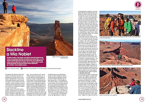 Světově známá a velmi úspěšná česká “slacklajnérka” Anna Hanuš Kuchařová představuje ve svém rozsáhlém a poutavém vyprávění osobnost nejlepší současné světové lajnerky, kterou je Kanaďanka Mia Noblet. Mia je spoludržitelkou světového rekordu v délce přechodu – bez pádu zvládla dva kilometry dlouhý přechod na lajně zavěšené ve výšce několika stovek metrů. Článek přibližuje nejen slackline, ale hlavně proces postupného posouvání osobních hranic a překonávání vlastního strachu slaklajnérů při pohybu po dlouhé úzké lajně napjaté vysoko nad údolím. Zajímavé čtení s mnoha jedinečnými fotografiemi najdete na stranách 18-23.