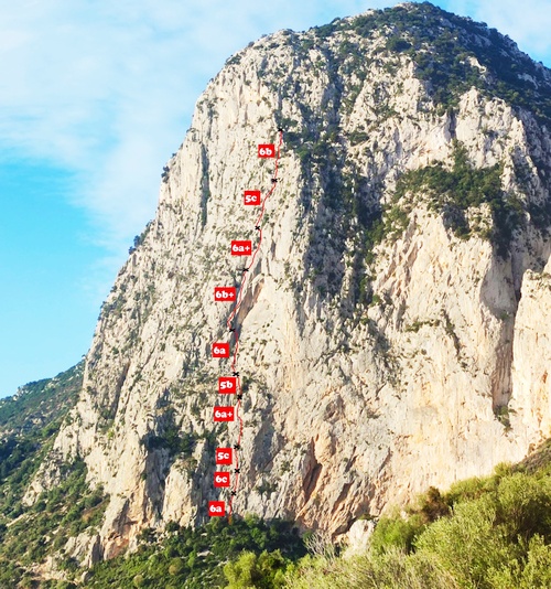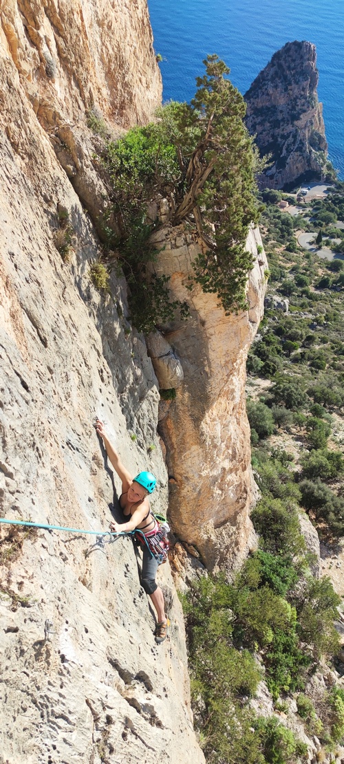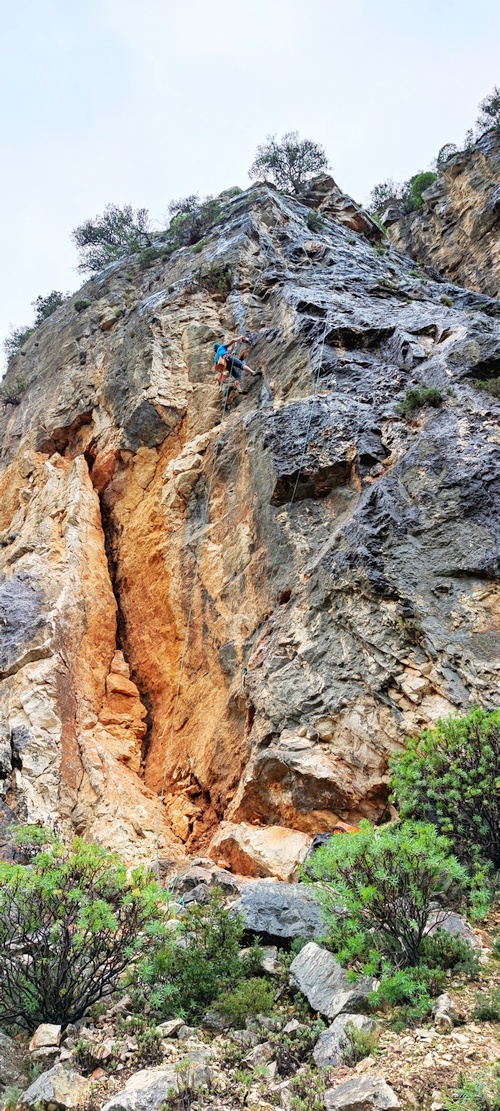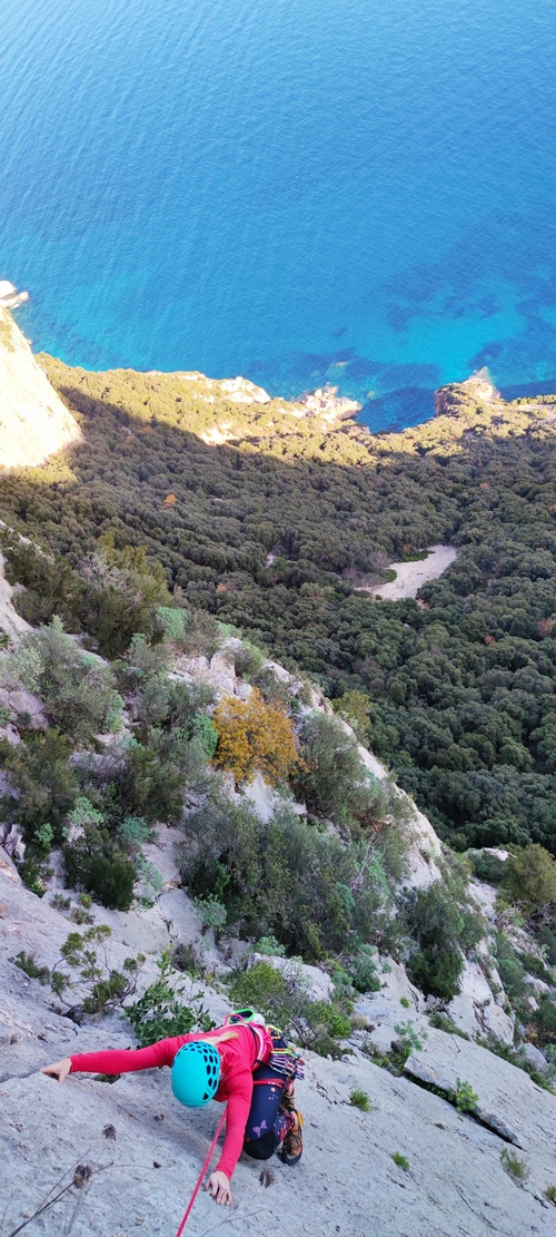 Kvůli horšímu počasí jeden den jsme vrtali i 2 kratší cesty 50 m od auta před nejznámější oblastí Sardinie. Nechápu, že to nikdo neudělal dříve😉 První je 7a+, velmi atletická, a 6b+ technické lezení v neostré skále, to se bude určitě líbit 😉