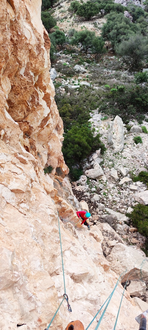Když jsme tam dolezli a já začal vrtat, zjistil jsem ten problém, bylo těžké ve spleti krápníků najít místo k zavrtání nýtů. Když člověk vrtá z volné pozice, drží se jednou rukou chytu, skála lehce převislá a nemůže najít místo pro nýt, je to trošku trénink vytrvalosti😉 Pak jsme ještě dodali řetěz doprostřed stěny na slanění a cesta je hotová. Ten den nám pomáhal místní lezec, který dělá web na cesty po Sardinii a slíbil, že na RP pokus přinese dron 😉