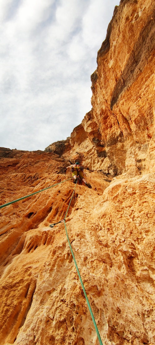 V létě jsme rozdělali první naší společnou cestu s názvem HAPPINESS, dostali jsme se asi do 150 m, na podzim jsme přidali cca 80 m a teď jsme to konečně dolezli a 320m cesta s jedním těžším úsekem za 6c byla hotová. Nýty kousek od sebe, pohodlné štandy a na nich řetězy s karabinami, které vždy potěší 😉 Přístup je od známé Pedra Longy asi 20 min podél moře a celou dobu je vidět Punta Giradili, kde je náš nejtěžší projekt středem jeskyně, který jsme vrtali s Honzou Hrnčířem.