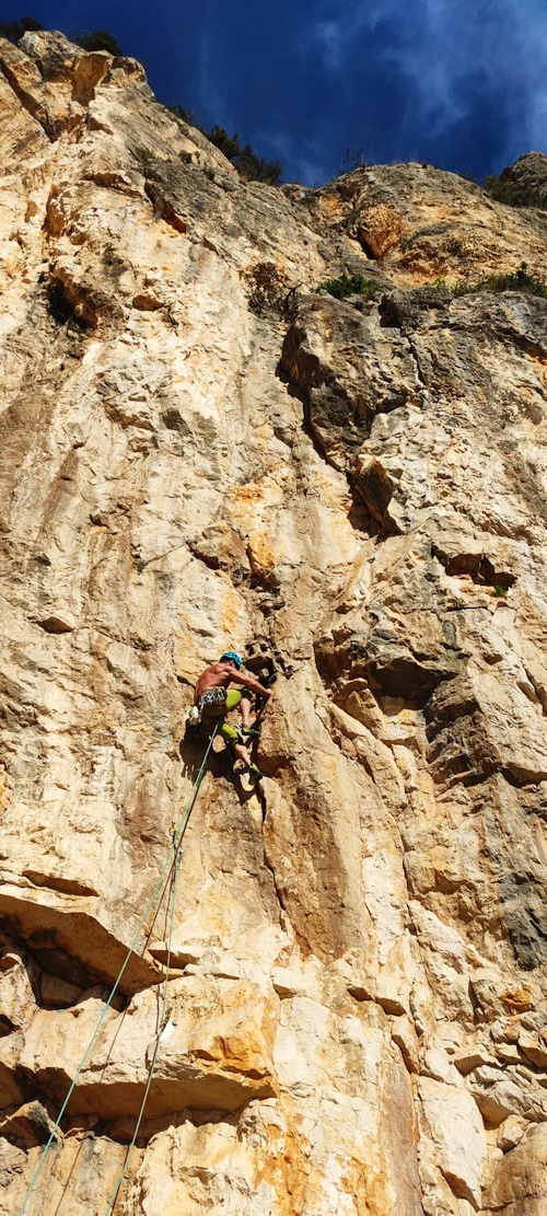 První délka má 17 expresek a nějaké jsem dal dvojité, tak jsem na sobě měl 24 expresek a šel na pokus o RP. Vedro bylo takové, že mi tekl pot po čele a kapal dolů. U pátého nýtu mi vystřelila ruka a já musel dolů. Stáhnul jsem lano a na další pokus jsem se víc koncentroval a první atletická délka za 7b+ byla přelezena. Pak další 6c v krásné skále a v 7a+ po krápnících slyším, jak dron vedle mě má jiný zvuk. Narazil do skály kvůli poryvu větru a padá k zemi. Naštěstí se dole chytil a nerozbil se, tak bohužel chybí natočení posledních pár metrů.