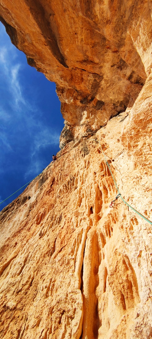 Lehce převislý kout, 80 m vysoký, vlevo krápníky, úplný sen. Takový Kalymnos styl. Jen najít ideální směr 😉 Zvolilo se začít vpravo a po nej skále, jak to pustí se dostat ke krápníkům. První den vrtání jsme se dostali ke druhému řetězu a před námi dýlka s krápníky. Nemohl jsem ani dospat 🤣
