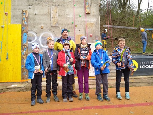 Samostatnou kategorií pak bylo zápolení mladších ročníků. Oba mládežníci kategorie B se neztratili i v celkovém pořadí (Tereza Cikánková 3. místo, Matyáš Lienerth 6.místo). Všech sedm cest zkusily vylézt ještě Aneta Borovcová a Lucie Veselá, ti menší pak zůstali u dvou, či tří cest, vhodných jak pro jejich výšku, tak zejména lezení v lezečkách, přeci jen drytoolové boty velikosti 34 a menší jaksi nemáme :-)