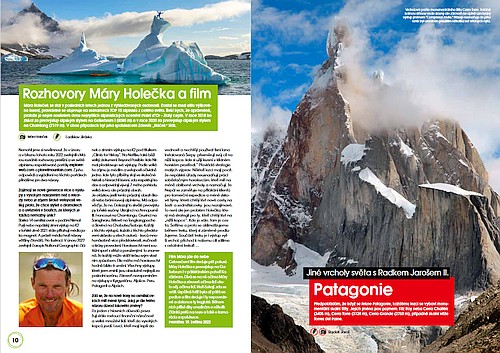 Radek Jaroš nám tentokráte představuje jihoamerickou Patagonii a monumentální skalní štíty Fitz Roy, Cerro Torre, Cerro Grande a další. Vyznavačům vertikál pak Radek připravil tip pro případ trvale špatného počasí, které v těchto končinách vládne většinu roku, skalní věže vhodné pro lezení i bouldrování v blízkosti střediska El Chaltén. Zajímavý tip pro vaši budoucí lezeckou výpravu s mnoha fotografiemi najdete na stranách 11-15.